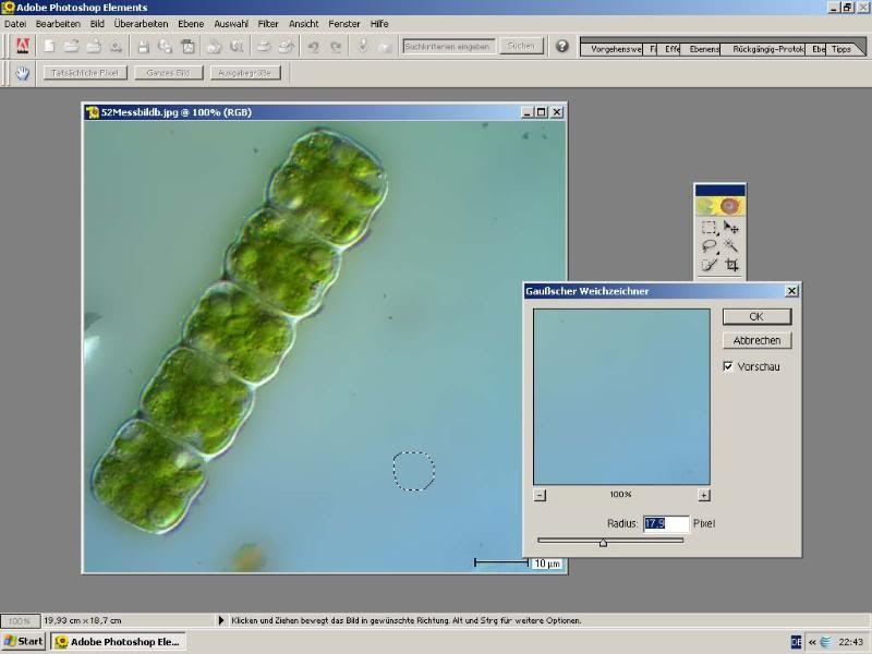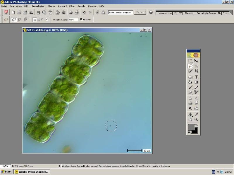 Da mich Oliver selbst per PN gefragt hat, denke ich, dass ich hier einmal kurz eine ( von vielen! )  Möglichkeiten des "Putzens" zeigen darf. Ich verwende gerne ein Uralt-Version von Photoshop elements ( 2.0 ). Benötigt kaum Ressourcen, kostet bei ebay fast nichts und bietet alles, was der Mikroskopiker an EBV benötigt.