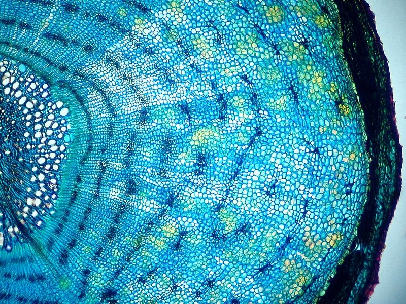 Verkorke Phloemzellen, Phloem mit Siebzellen und Milchröhren, Cambium und Xylem mit Tracheen
