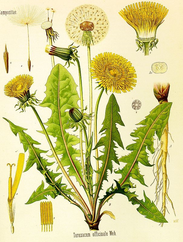 Köhler hat deutlich mehr Details in seiner Zeichnung unter gebracht, neben einem Schnitt des Blütenkorbes findet man hier auch die Pfahlwurzel des Löwenzahns, die als Radix taraxaci zu den 'offiziellen' Drogen gehört.