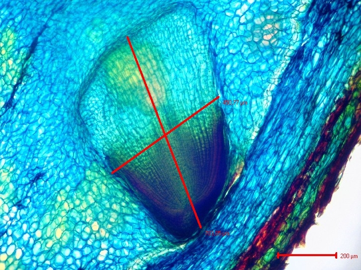 Bild 13a/b: Eine neue Seitenwurzel vor dem Durchbrechen der äußeren Zellschichten, Vergrößerung 100x, Stapel aus 11 Bildern. Bild 13b mit Bemaßung.