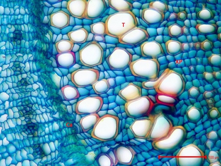 'klassische' Primäre Rinde, Endodermis, Phloem mit Siebzellen und Milchröhren, Cambium und Xylem mit Tracheen