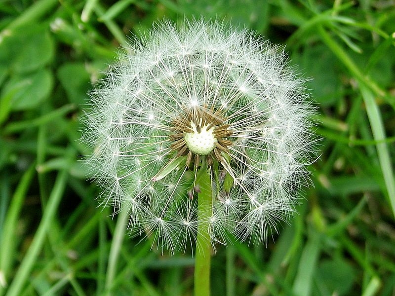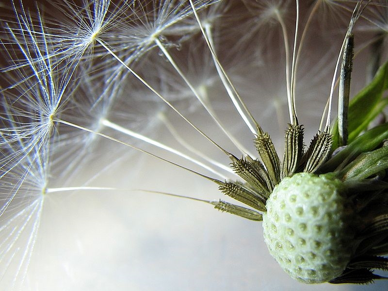 Die an einem haarigen Flugschirm (Pappus) hängenden Früchte (Achänen) des Löwenzahns bilden später die kugelige "Pusteblume", bevor sie vom Wind verbreitet werden.
