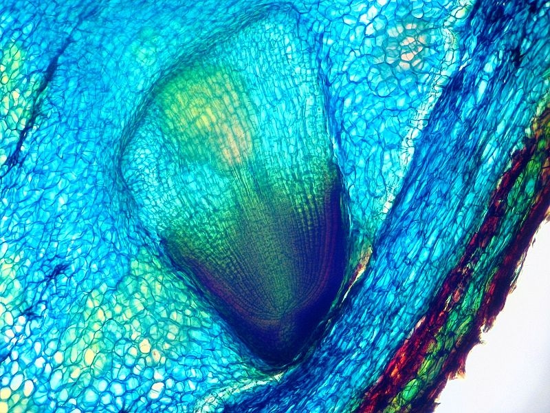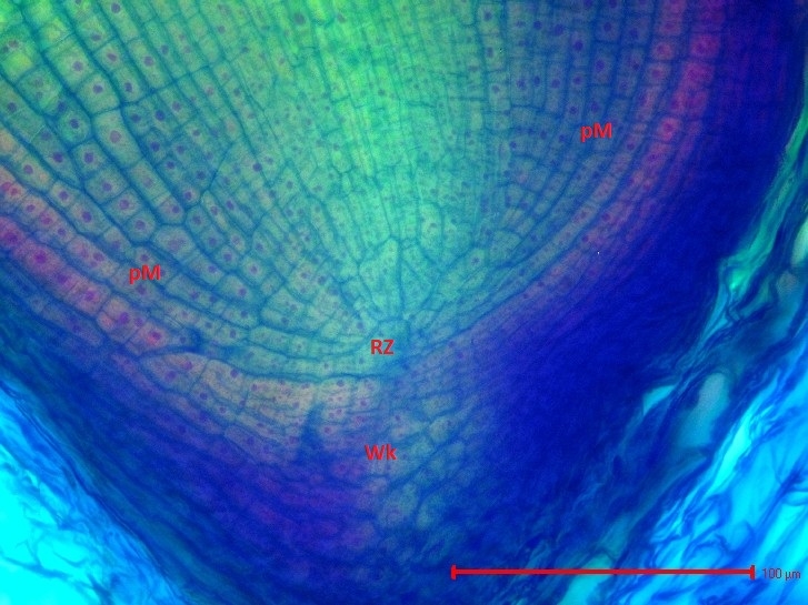 Eine kleine Kritik zu der, eigentlich sensationell gut getroffenen Seitenwurzelanlage: Eine Scheitelzelle gibt es bei den Blütenpflanzen nicht. die Sache ist etwas kompliziert. Es gibt ein sog. ruhendes Zentrum, an dessen Peripherie nach oben Wurzelzellen und nach unten Zellen der Wurzelhaube (Kalyptra) abgeschieden werden.