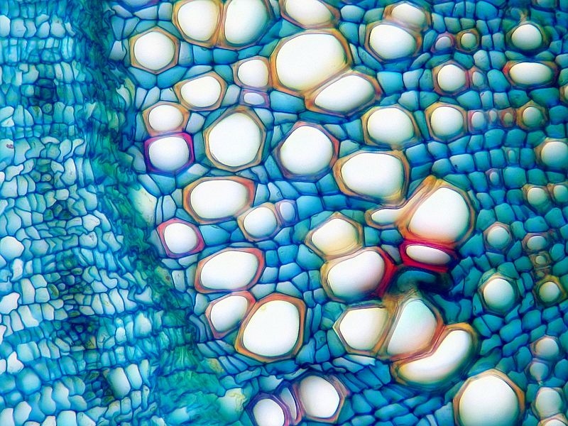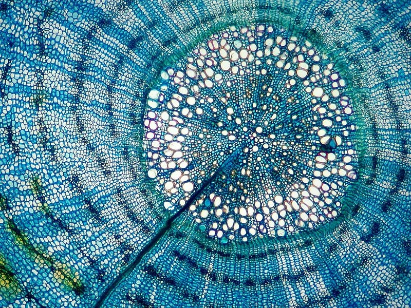 Bild 7: Querschnitt durch die Pfahlwurzel des Löwenzahns, vom Zentralzylinder links bis zur Endodermis als äußerster Zellschicht rechts, Vergrößerung 50x, Stapel aus 8 Bildern