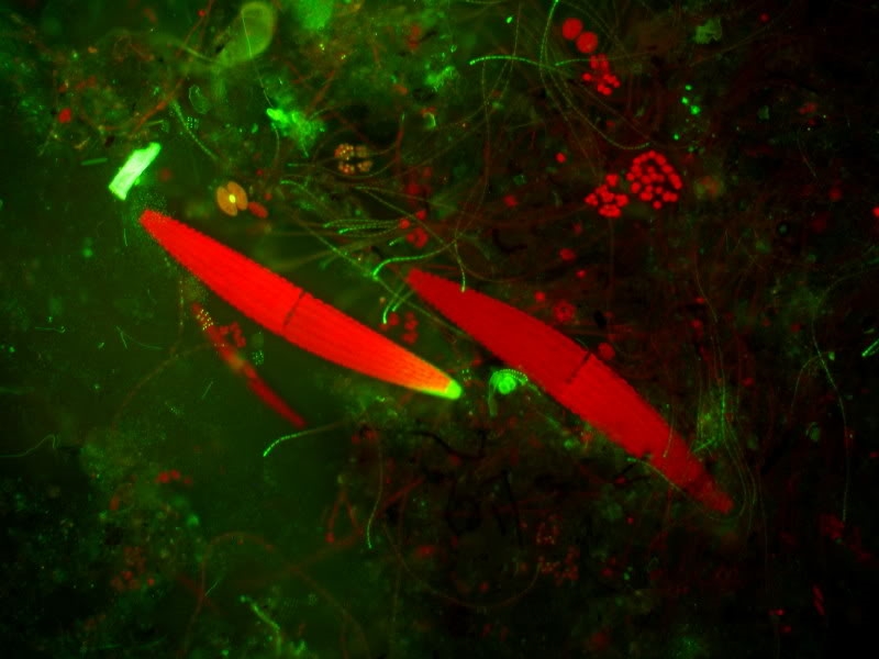 Bild 2: Auflichtfluoreszenz Blauanregung. Man sieht die Rotfluoreszenz des Chlorophylls