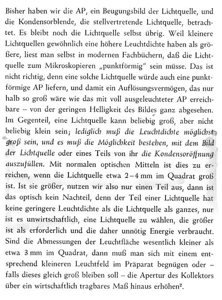 Im Prinzip könnte man auch meiner Meinung nach eine gut streuende Scheibe - z.B. aus Trübglas - direkt vor der Kondensorblende (also in der unteren Brennebene des Kondensors) positionieren. Bei genügend gleichmäßiger Beleuchtung wirkte dann ihre variable, von der Kondensorblende jeweils frei gelassene Fläche dort nicht mehr als stellvertretende, sondern als flächenhafte "primäre" Lichtquelle. Das ist natürlich mit einem starken Intensitätsverlust verbunden, und man könnte mit Hilfe der Sehfeldblende der Leuchte die Beleuchtung des Sehfeldes in der Objektebene nicht mehr begrenzen. (Köhlern wäre also "halbiert").