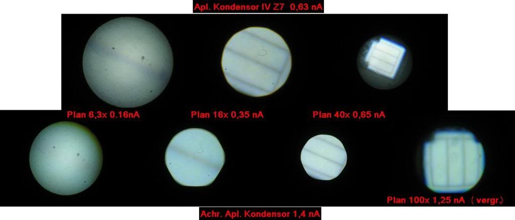 Ich denke man erkennt deutlich, dass hochnumerische Objektive einen entsprechend hochnumerischen Kondensor benötigen um die AP vollständig auszuleuchten. Die Größe der Cree LED ist zusammen mit dem 1,4 Kondensor für das 100x Objektiv gerade noch ausreichend.