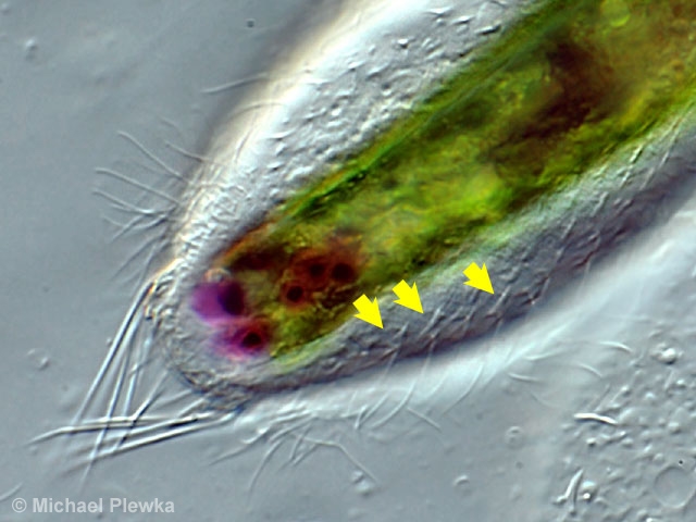 Auffällig ist die intensiv gefärbte Nahrung die ich in der Probe selbst o nicht gefunden habe. Dabei fällt auf, dass die rotviolett gefärbten Nahrungsteile in Vakuolen sind. Unklar ist laut SCHWANK, ob N. antennigera bzw. N. voigti getrennte Arten darstellen. N. voigti soll sich von N.a. durch die Schuppen unterscheiden, auf denen die Stacheln inserieren. Die Stacheln scheinen bei meinen Exemplaren auf dreilappigen bzw. dreieckigen Schuppen zu sitzen (gelbe Pfeile).
