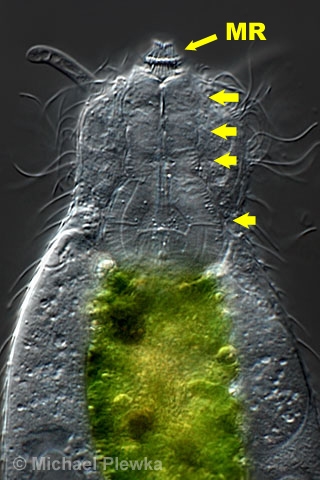 Auffällig sind weiterhin  zwei Drüsenpakete ?unbekannter? Funktion (gelbe Pfeile, links), sowie  der vierteilige Pharynx (4 gelbe Pfeile), und der Mundbereich mit einer Mundröhre (MR), die stark kutikularisierte Längsleisten aufweist. (rechts):