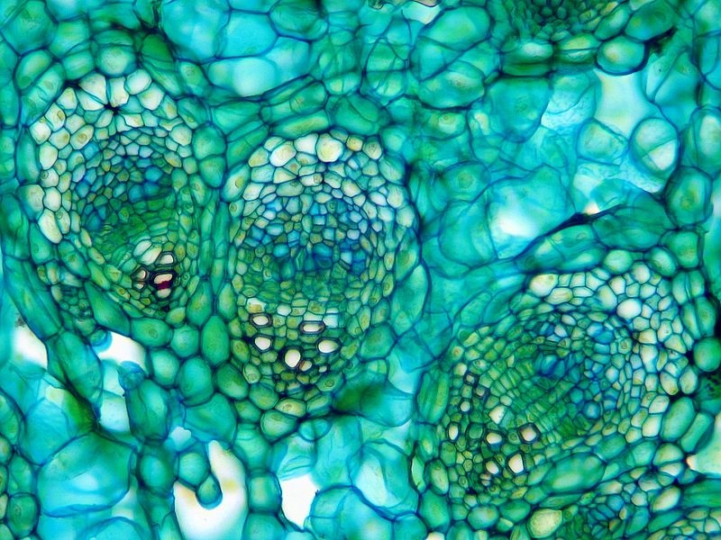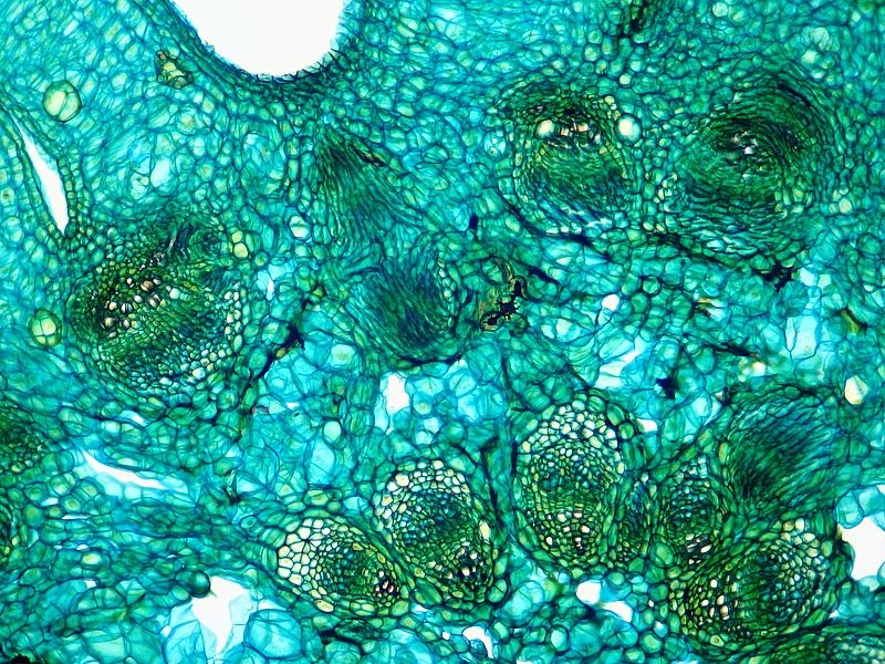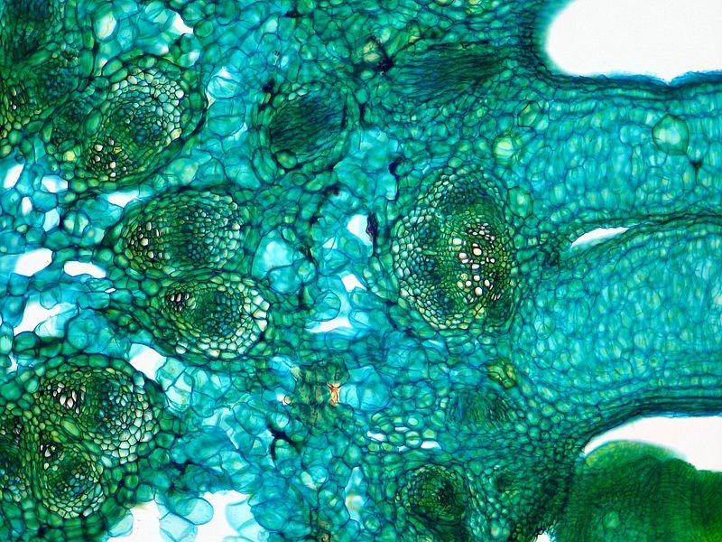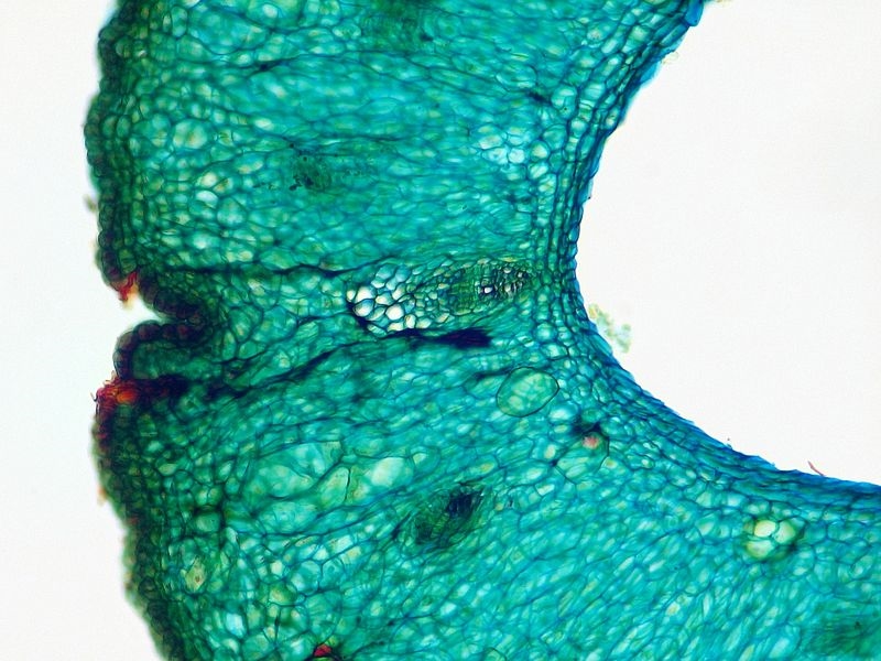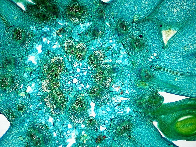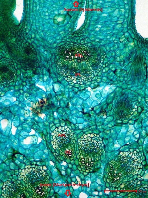 Seltsamer Weise ist nun der Aufbau der Leitbündel spiegelverkehrt. Die innen liegenden Bündel zeigen klassisch ein innenliegendes Xylem, gefolgt vom Phloem. Bei den äußeren Bündeln ist die Reihenfolge jedoch umgekehrt: das Xylem schließt sich außen an das innenliegende Phloem an.