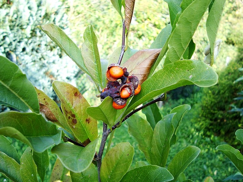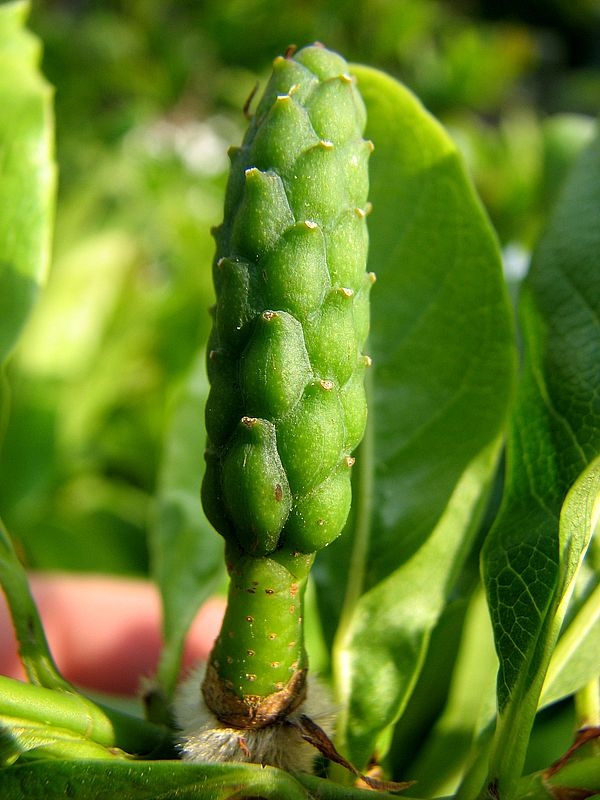 Nachtrag vom 15.09.2012: im letzte Jahr gab es dann doch einige befruchtete Blüten an unserer Sternmagnolie, so dass sich später früchte entwickelten. Im gezeigten Beispiel sind allerdings nur zwei befruchtete Fruchtanlagen zur Entwicklung gekommen, der Rest ist unbefruchtet.