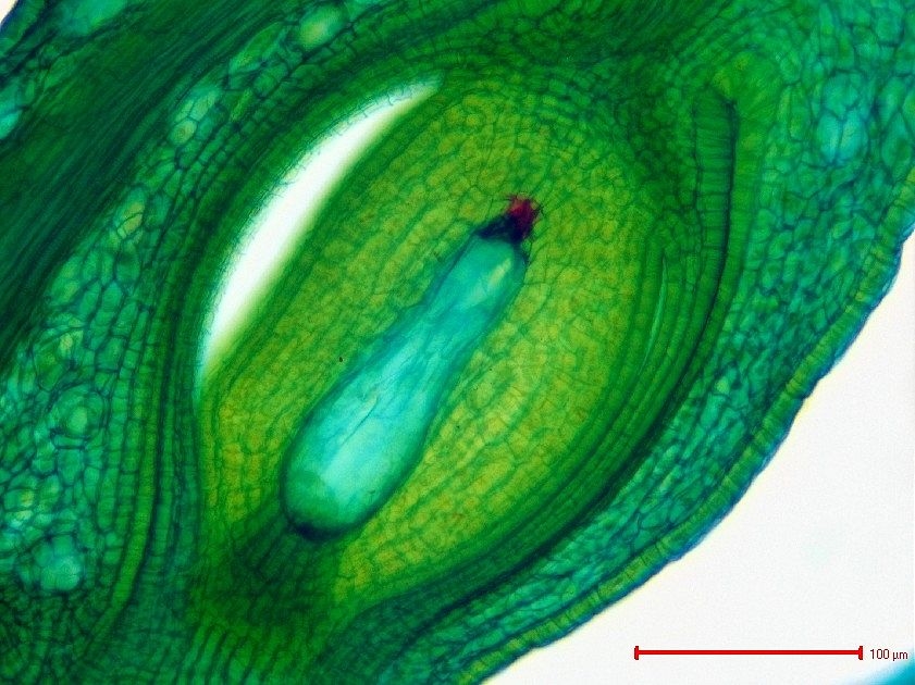 Gut erkennbar das Leitbündel zur Versorgung des sich bildenden Samens. Die größte Länge der Samenanlage beträgt etwa 800 µm.