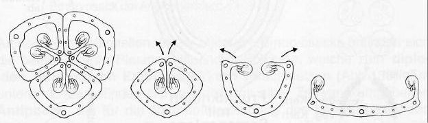 Die theoretische Ausrollung der Fruchtblätter zeigt die randständige (marginale) Position der Samenanlagen, die sich wahrscheinlich aus randständigen Megasporangien entwickelt haben. Aus: D. Böhlmann ,,Botanisches Grundpraktikum zur Phylogenie und Anatomie" (UTB Quelle & Meyer 1994)