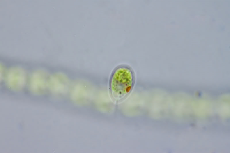 Hierzu würde auch die Zoospore passen, die den roten Fleck und die Geiseln - hier nur 3 von 4 sichtbar - besitzt. ( siehe auch "Der Kosmos Algenführer, Seite 266, Ausgabe 2007 ).