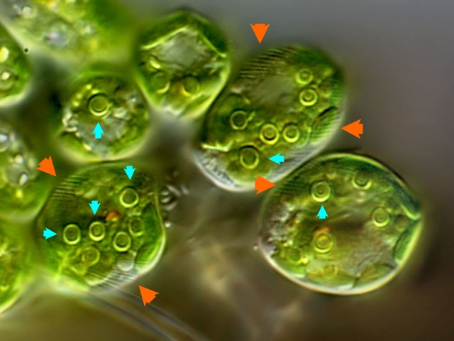 In einem Ausschnitt der obigen Aufnahme kann man gut die Pyrenoide  (blaue Pfeile) sowie die spiralförmig verlaufende Pellikula  (rote Pfeilspitzen) sehen: