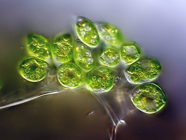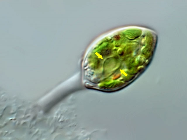 Hier noch ein einzelnes Exemplar. Die Zellen besitzen in  einer beweglichen Phase ein Flagellum, welches beim Übergang zur festsitzenden Form eingeschmolzen wird, Die sessilen Zellen von C. vesiculosum weisen einen Gallertstiel auf. Im vorliegenden Exemplar war die Geißel an ihrer Bewegung noch zu erkennen (gelbe Pfeile):