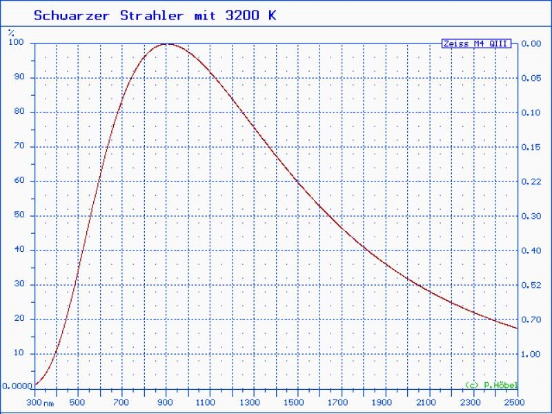 Das Spektrum einer Halogenleuchte (hier idealer schwarzer Strahler) bringt genau dort das Maximum an Strahlungsleistung wo es gebraucht wird. Jede Halogenfunzel mit 15 oder mehr Watt bringt mehr als eine Super Power IR-LED.