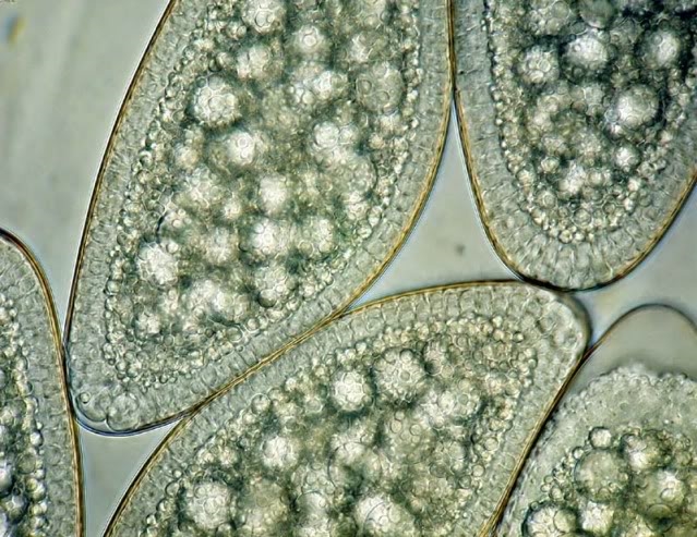 Die Gebilde sind um 190 µm lang und ca. 80 µm breit. Die Blasen in Bild 2 rühren wohl von zerstörten "Eiern" her - könnten das Lipide als Speicherstoffe sein?
