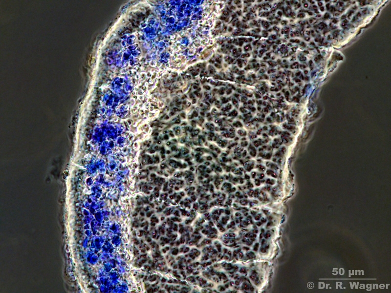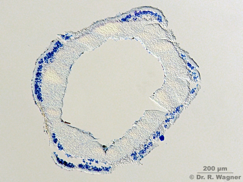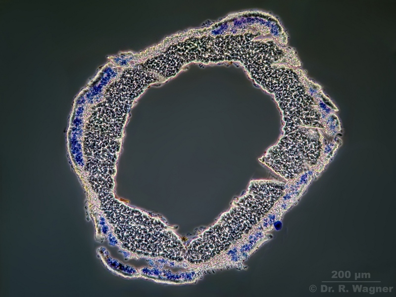 - QS Podetium, Färbung mit Lactophenol-Methylblau-Acidfuchsin. Außen berindet, innen hohl.