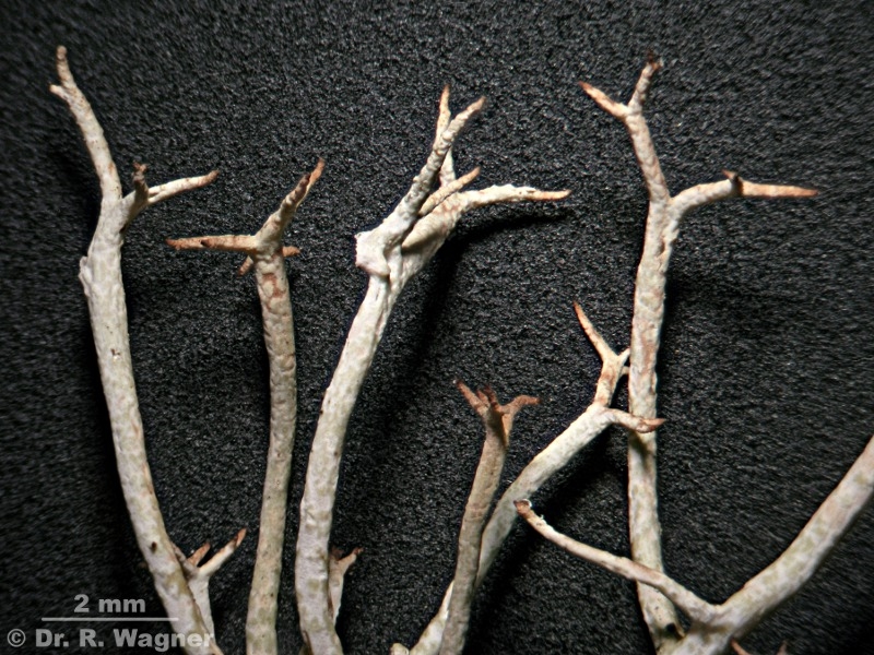 - Nahansicht Podetien. Dichotom verzweigt, teilweise gescheckt durch offene, weße Stellen ohne Algen.