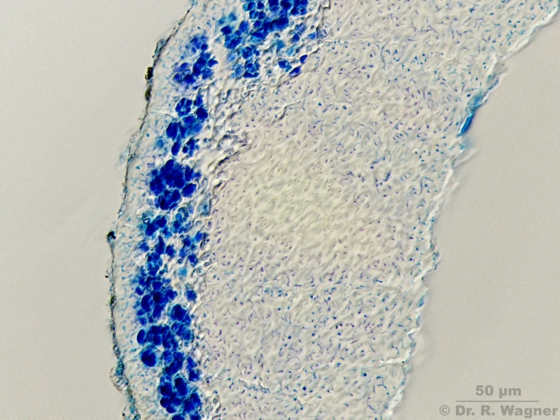 - QS Podetium, Nahansicht, Färbung mit Lactophenol-Methylblau-Acidfuchsin. Schichtfolge: Äußere Rinde, Algenschicht, Medulla, feste Medulla, Hohlraum.