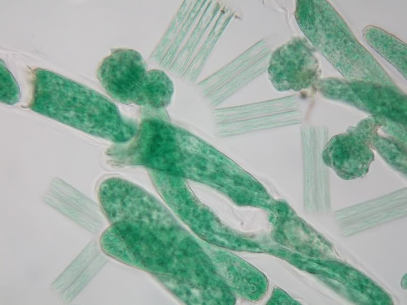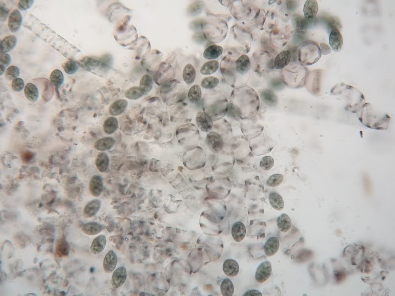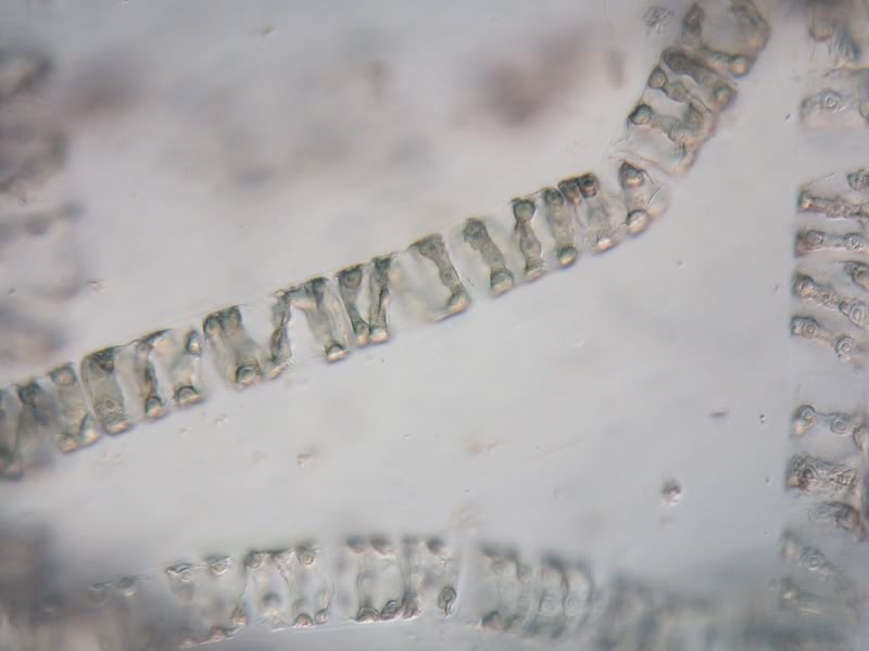 2. Ebenfalls Süßwasseralgen aus Plankton (Wakenitz/Lübeck), diesmal zu Hause in der Fixierlösung nach Kisser ,,vital" fixiert, in Glyzerin entwässert und in Glyzeringelatine mit Lackrand eingedeckt (die Zusammensetzung findet sich z.B. hier: http://www.aeisner.de/rezepte/fixant43.html).