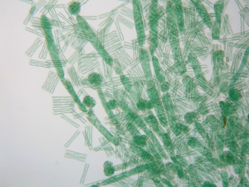Die Algen wurden mit dem Planktonnetz vom Steg aus gefangen und zu Hause mit Chromessigsäure fixiert und danach mit Alizarinviridinchromalaun gefärbt. Anschließend wurden sie im Sedimentverfahren (ohne Zentrifugieren) in Glyzerin entwässert und in Glyzeringelatine nach Kaiser mir Lackring eingedeckt.