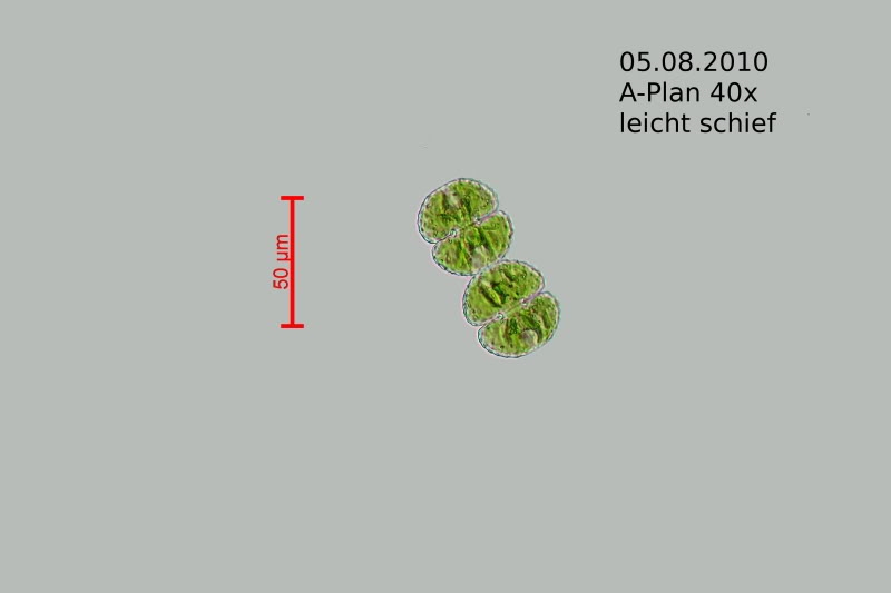 wegen der Kleinheit der Abbildung ist eine präzise Bestimmung nur bedingt möglich, aufgrund der Zellform tippe ich aber auf Cosmarium obtusatum im Stadium nach vollendeter Teilung kurz vor der Trennung der beiden Zellen.