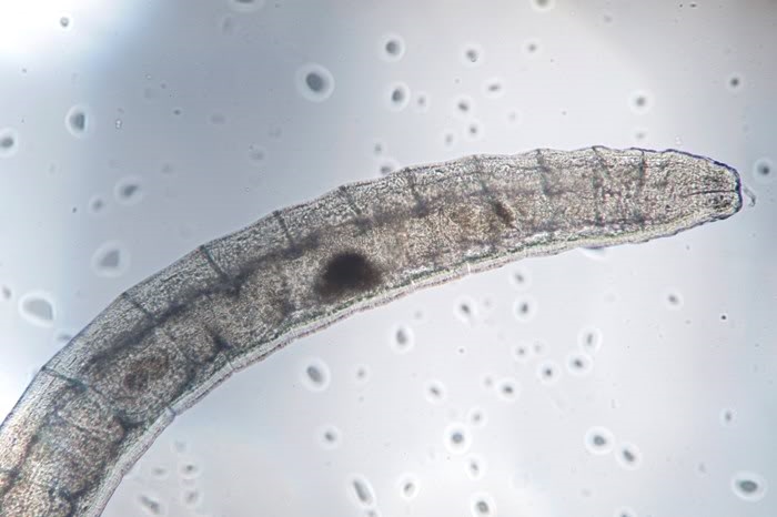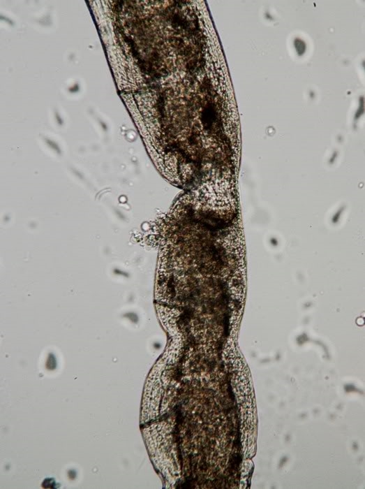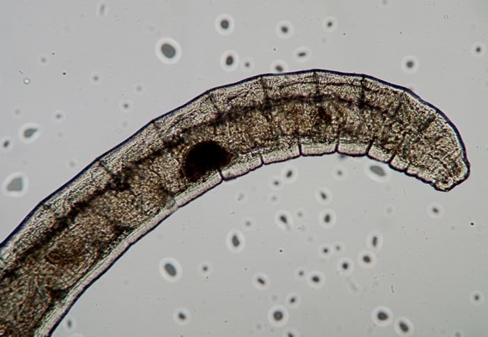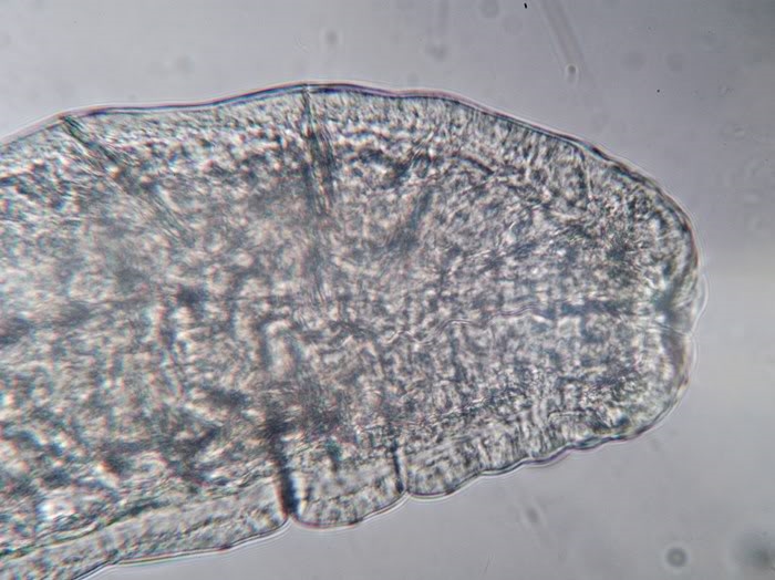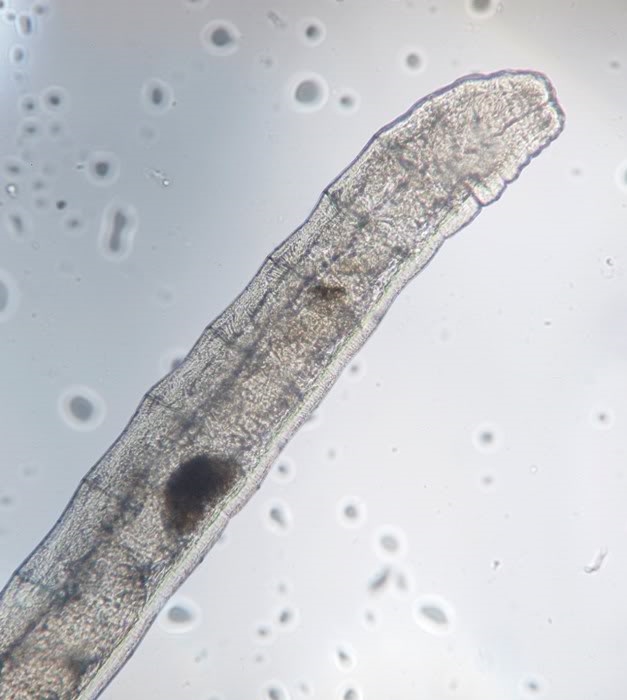 Hallo an Allen,m ich fand dieses Wurm in Sumpf neben Hochmoor, in Moos (Polytrichum sp), zwischen Wurzeln. Es ist etwa 3 mm lang. Was könnte es sein? Es hatte kein 'Schwanz', sondern sah es so aus, als hätte es gerade ein Teil verliert, vielleicht als Fortpflanzung wie einige Anneliden, wie Chaetogaster.