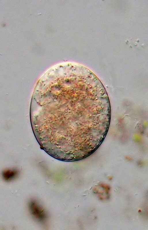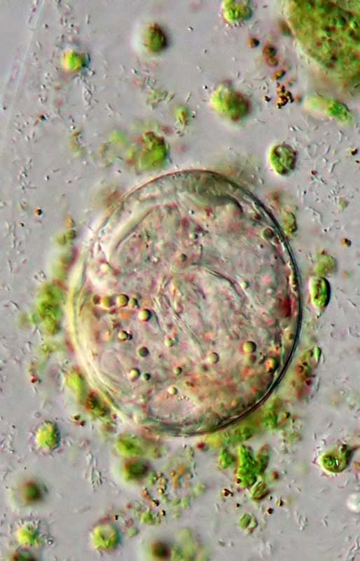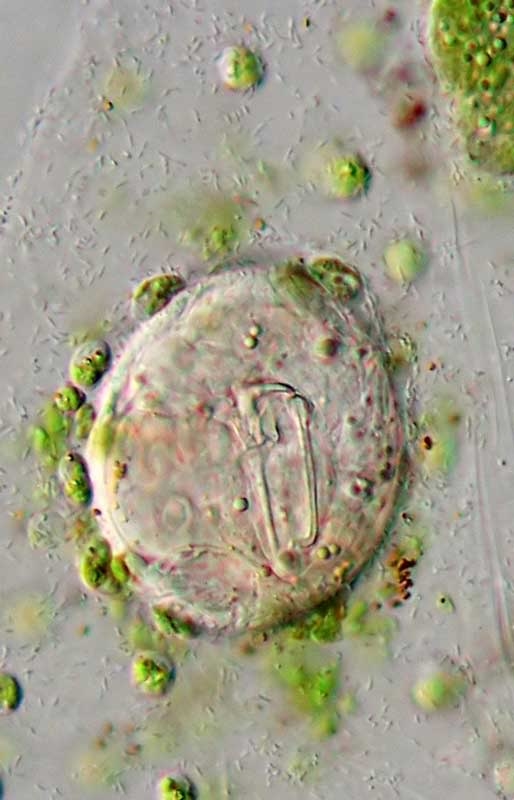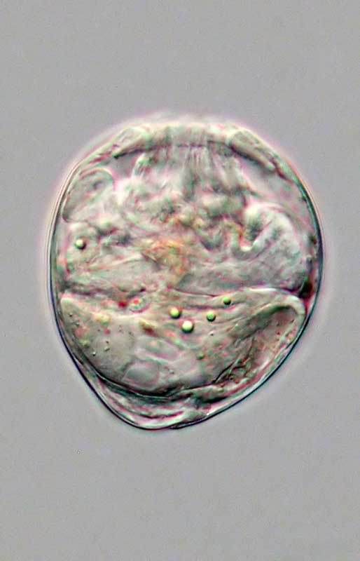 in einer letzten Freitag vor dem Treffen des Arbeitskreis Mikroskopie Rhein-Main-Necker im Botanischen Garten Darmstadt genommen Wasserprobe fiel mir beim durchmustern mit dem Stereomikroskop eine ungewöhnlich alt und häßlich aussehende Volvox aureus-Kolonie auf. Ich habe die Kolonie dann auf einen Objektträger überführt und ohne Deckglas bei schwacher Vergrößerung unter dem Mikroskop betrachtet. In der Volvox-Kolonie, in der nur noch wenige Zellen vorhanden waren, konnte ich zwei Rädertiere und drei Eier erkennen. Fast sofort nachdem ich ein Deckglas aufgelegt hatte, bohrten sich die Rädertiere durch die Wand der Kolonie ins Freie und schwammen mit außergewöhnlich hoher Geschwindigkeit davon. Deshalb kann ich hier kein Foto von dem Rädertier in der Volvox-Kolonie zeigen. Durch vorsichtiges Absaugen von Wasser konnte ich das Deckglas so weit absenken, daß ein Rädertier nur noch langsam umherschwimmen und fotografiert werden konnte. Bei dem Rädertier handelte es sich um Ascomorphella (Hertwigella) volvocicola, das als Parasit im Inneren von Volvox-Kolonien lebt und sich von den Algenzellen ernährt. Die folgende Bilderserie zeigen A. volvocicola vollständig gestreckt (Länge ca. 110 µm), schwimmend und kontrahierte, sowie ein Ei und, auf zwei verschiedene Ebenen fokussiert, einen Embryo. Alle Aufnahmen DIC.