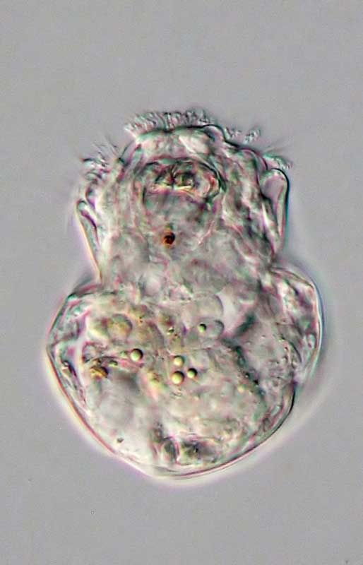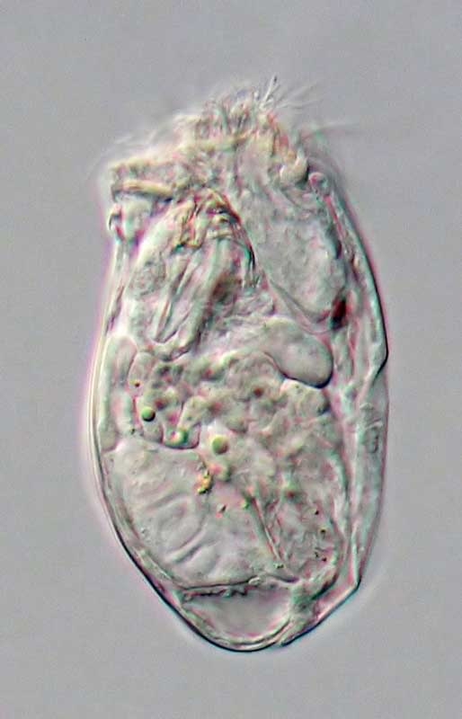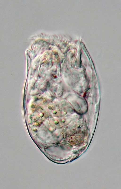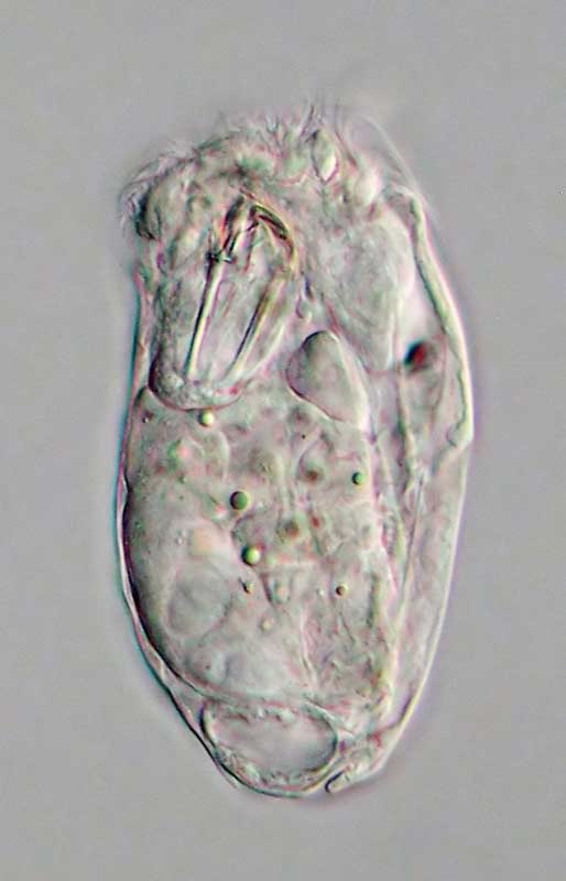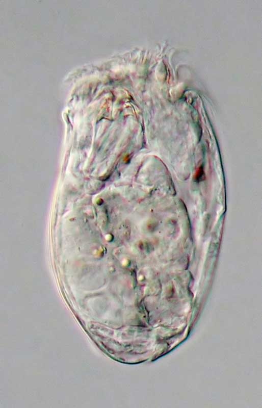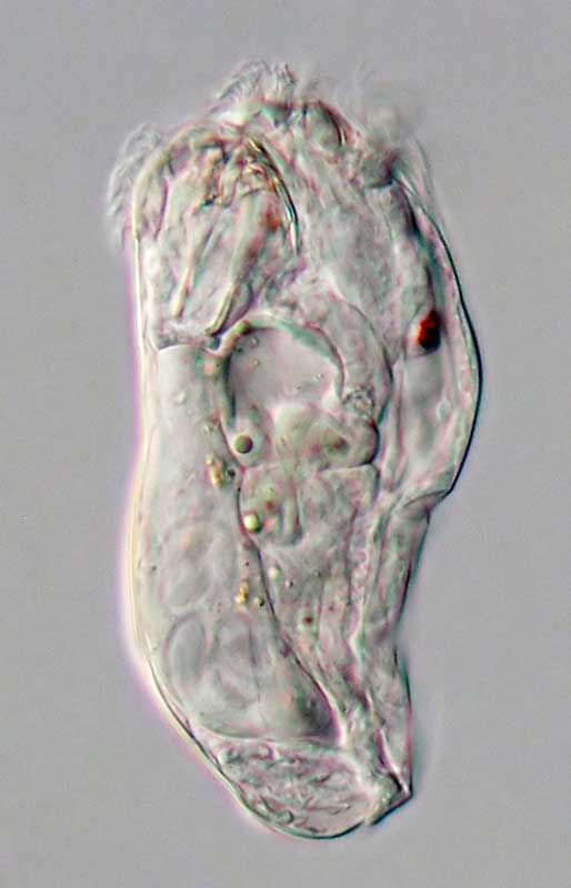 das gestreckte Tier auf dem ersten Foto ist 110 µm lang. Alle anderen Fotos haben den genau gleichen Abbildungsmaßstab.