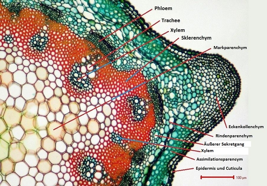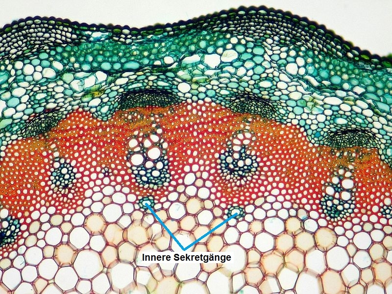 Die Sekretkanäle im Markparenchym und vor der "Phloemkappe" sind gut zu erkennen. Ebenso das Fehlen eines Cambiums zwischen Xylem und Phloem (geschlossen kollaterales Leitbündel).