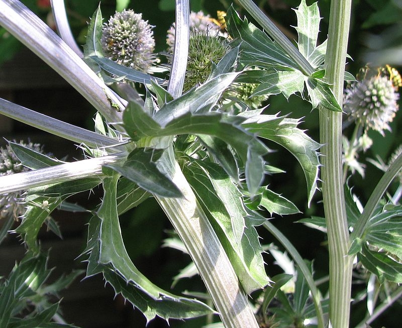 Der Blütenstand besteht aus vielen eiförmigen Dolden, Hochblätter und Hüllblätter sind glatt lanzettförmig und ebenfalls stachelbewehrt. Die Stängel sind teils intensiv blau gefärbt.
