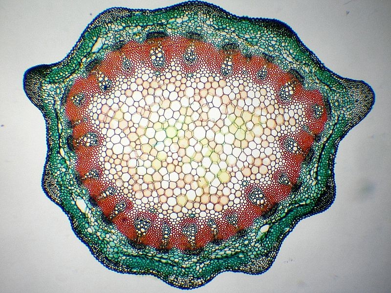 Die Stabilisierung erfolgt sowohl durch einen massiven Sklerenchymring, der nur das Xylem einschließt, als auch durch  hier 11 Eckenkollenchyme in den Ausbuchtungen des Querschnitts. Der Durchmesser beträgt ca. 2,3 mm an der breitesten Stelle.