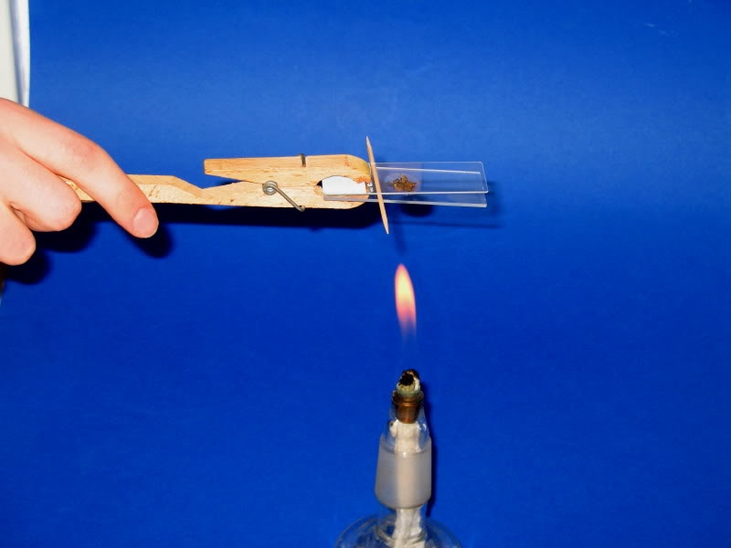 War viel zu lange erhitzt, die Reagenzglasklammer ist schon angekokelt.