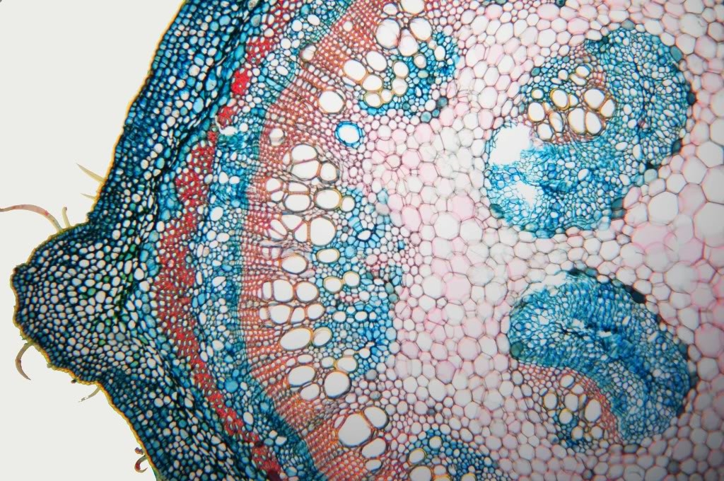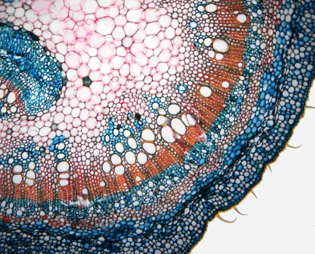 Zellwände blaugrün bis grün, verholzte Zellwände leuchtend rot. Zellwände der äußeren Hypodermis orangerot