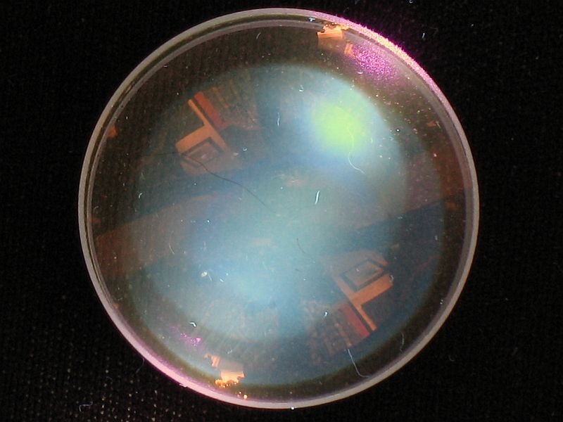 Es sind an den Verbindungsstellen von Kron- zu Flintglas leichte Kleberückstände zu erkennen, was hoffentlich keine trügerische Absicht ist. Der Linsenkleber ist auch wesentlich farbneutraler als der der russischen (Belomo) Einschlaglupen. Der von Werner vorgeschlagene "Achromat-Test" fällt ebenfalls positiv aus.