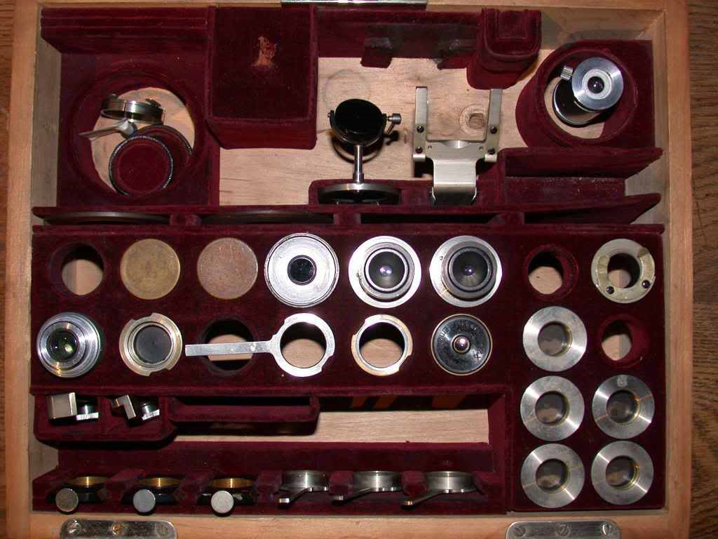 Dazu ein Leitz-Kasten aus der gleichen Zeit (ich schätze ca. 1940 - 50) mit ähnlichem 'Outfit'. Vielleicht kennt hier im Forum Jemand den Einsatz dieser Ausrüstung? Das fragliche Objektiv stammt allerdings nicht aus diesem Kasten, aber aus einem Einsatz mit identisch dunkelviolettem Samt. Das Ultropak-Objektiv gehört ebenfalls nicht dazu. Es ist jüngeren Alters und wurde noch lange, m.W. bis zum Ortholux, gebaut.
