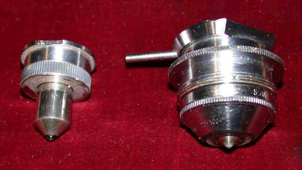 Rechts ein Ultropak mit Objektiv: A 0.80 U-0 55-W; auf der äußeren Hülle steht 55 W (also 55 x Vergrößerung, Wasserimmersion) und '22-100' (was diese zwei Zahlen bedeuten, ist mir rätselhaft)