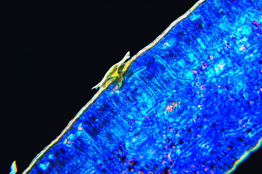 Die Beobachtung von Klaus möchte ich bestätigen: es scheint auch auf der Blattoberseite Trichterhaare zu geben. Schön zu sehen auch am linken Bildrand von Bild 8. Das mehrzellige Haar dort sitzt auf einem roten (sklerifizierten) Stiel und liegt in einer kleinen Vertiefung ganz eng an der Cuticula an.