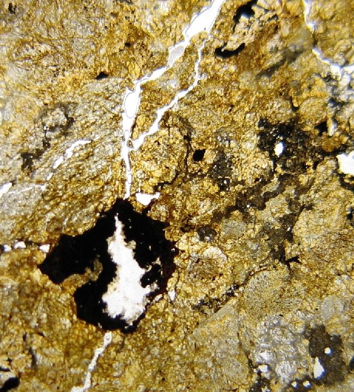 Sehr dunkle Stellen sind Eiseneinschlüsse die sich während der Entmischungsphase des Meteoriten gebildet haben.