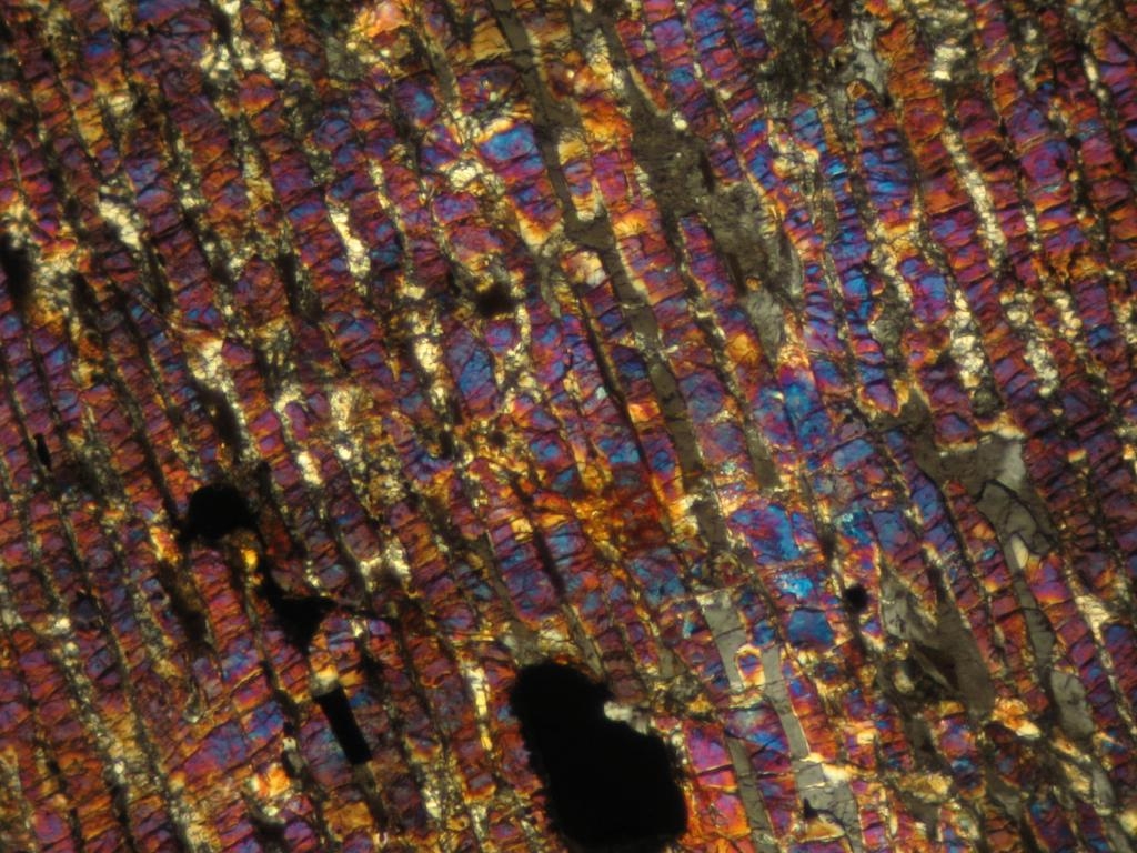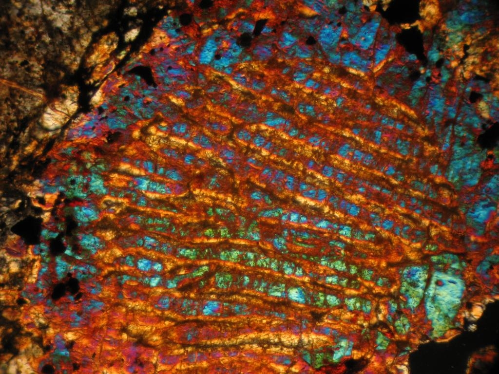 Durch die unterschiedlichen Mineralien im Meteoriten sowie der wechselnden Schliffstärke, werden im polarisierten Licht die entsprechenden Farbabstufungen sichtbar.