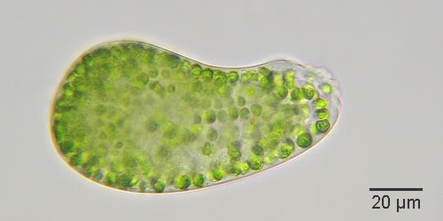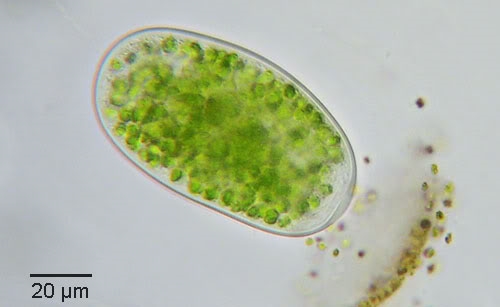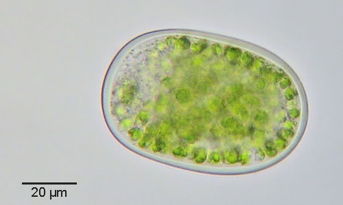 die folgenden drei Objekte fand ich in einer Probe aus unserem Gartenteich. Nr. 1 fand ich gleich zu mehreren - immer gleich aussehend. Die Bewegungen waren langsam, nicht kontraktil. Zunächst dachte ich an Stentor polymorphus, konnte aber - außer an der Mundöffnung im schmalen Viertel - keinerlei Bewimperung erkennen.