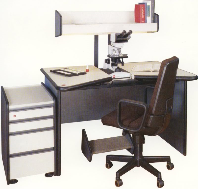 hier ein gescanntes Bild eines Leitz-Tisches mit dem sinnfälligen Namen Labodesk. Titel im Prospekt: "Der ergonomische Mikroskopierplatz LABODESK." Der Mittelteil, auf dem das Laborlux S steht, lasse sich soweit absenken, bis die Tischoberfläche mit dem Handauflagen am Mik eine Ebene bilden. Fußbank und abblendbare Beleuchtung gehörten dazu. Ein praktisches Beistellschränkchen für Zubehör könne zusätzlich erworben werden, so die Firma Leica dereinst. Es bleiben dem solventen Käufer also keine Wünsche offen.