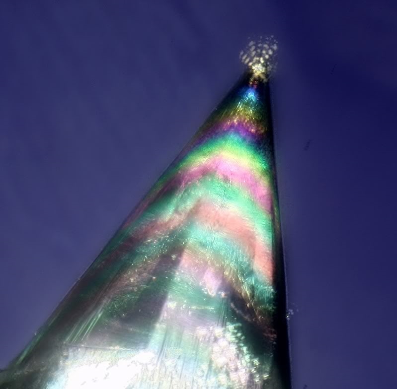 Und einmal zwischen gekreuzten Polfiltern mit Quarz Rot I. Der Workshopteilnehmer erkennt sofort die Verschiebung der Interferenzfarben von der Spitze weg und zur Basis hin, und wie sich ein schwarzer Streifen knapp unterhalb der Spitze durch den Kristall zieht.