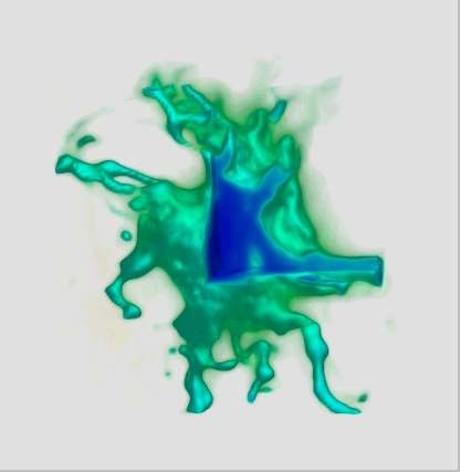 In einem sogenannten 3-D Renderer Programm kann man nun die Lücken zwischen den einzelnen Fokusebenen interpolieren, d.h. rechnerisch überbrücken, und mittels einem alpha-Kanal den entstandenen Block transparent machen und somit so weit erodieren ('abtragen'), dass man nur noch die interessierenden Strukturen erhält, im Beispiel hier den Zellkörper mit seinen Fortsätzen.