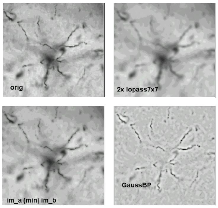 Vom Bild wird zunächst eine tiefpassgefilterte Kopie erzeugt (oben rechts) welche dann über eine Minimum-Funktion mit dem Originalbild kombiniert wird (unten links). Diese Massnahme hilft, die scharfen, kontrastreichen Anteile im Bild besser hervorzuheben und abzugrenzen.