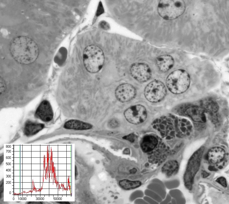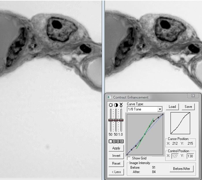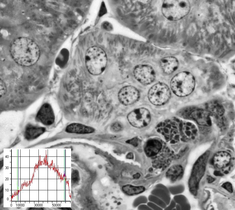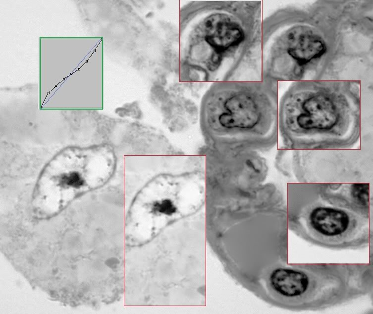 Das Bild weist nun sehr guten Kontrast in hellen, mittleren und dunklen Partien auf ! Viele Details, wie z.B. die Mitochondrien in der mittleren Zelle, sind deutlich besser sichtbar.