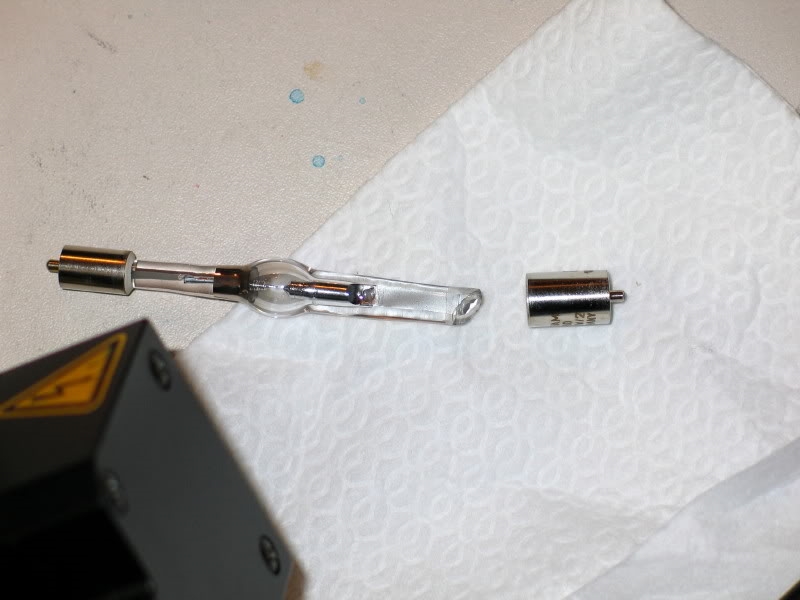 Ein schlagender Beweis, dass man die HBO unbedingt ausbauen muss vor dem Verschicken. Das ist ja ein fest eingespannter Glasstab, der am freien Ende den Kühlkörper mit Elektrode trägt. Und die Masse des Kühlkörpers wirkt bei Querbeschleunigung als Hebel : und dann macht es knax, wenn das Paket durch die Luft fliegt und auf der Seite landet.