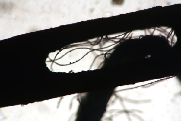 Das glaube ich mit ziemlicher Sicherheit nicht. Hier ist ein Foto von einer Nähnaldel mit Faden im Durchlicht (kein Stereomikroskop, ein biologisches Durchlichtmikroskop bei neidrigster Vergrößerung (4x Objektiv, 2.5x Fotoprojektiv, 40x beim Durchsehen). Es gibt keine Tiefeninformation (kein 3D) und man kann auch nicht die Oberfläche (Bemalung?) erkennen. Ich kenn mich zwar beim Miniaturen anfertigen nicht aus, aber ich kann mir nur schwer vorstellen wie das im Durchlicht gehen soll.